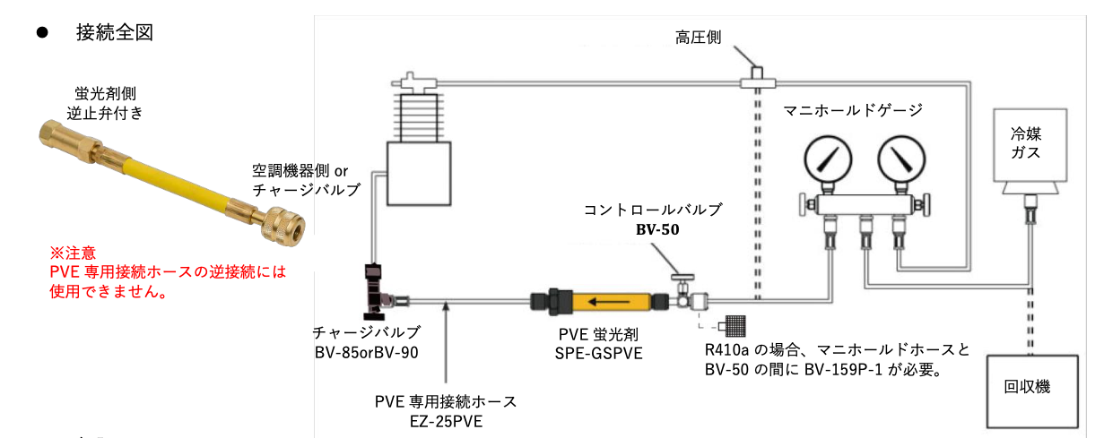 ゲージマニホールドの低圧側に付属のコントロールバルブ(BV-50)、空カプセル、PVE 専用接続ホース(EZ- 25PVE)、チャージバルブ(BV-85orBV-90)を接続全図のように接続し、冷媒ガスボンベのガス圧でホース内をエアパー ジします。 パージ完了後、すぐにコントロールバルブ(BV-50)とチャージバルブ(BV-85orBV-90)を閉じ、空カプセルを外します。