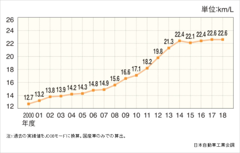 各社自動車メーカーは燃費向上のため、日々技術革新を行っています。下のグラフはガソリン自動車の平均燃費の推移です。いかに自動車メーカー各社が燃費に力を注いているのかがわかります。