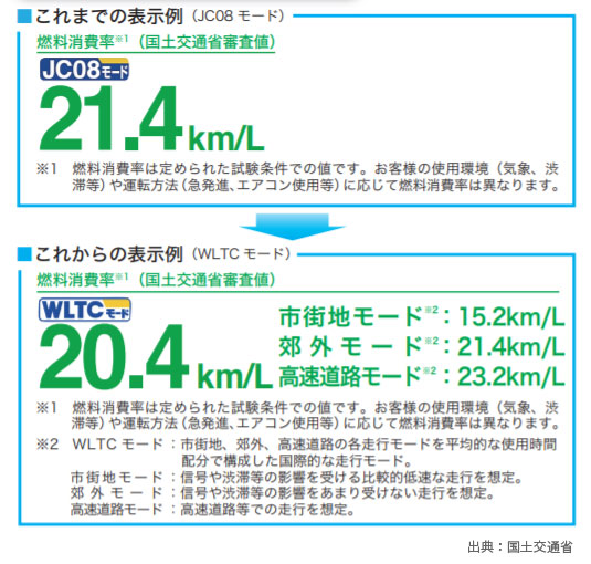 ところで、カタログ燃費の表示内容が変わっていることをご存知ですか。以前は日本独自の試験方法であるJC08モードで表示されていましたが、2017年夏ごろから国際的な試験方法であるWLTCモードに順次切り替えが行われました。