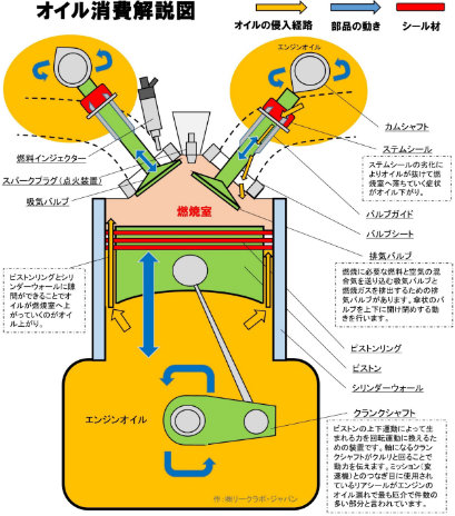 簡単な答えは、何らかの原因でエンジンオイルが燃焼室に侵入してしまうことでオイルが燃料と一緒に燃焼されてしまい、エンジンオイルが少なくなってしまう症状のことを指します。
